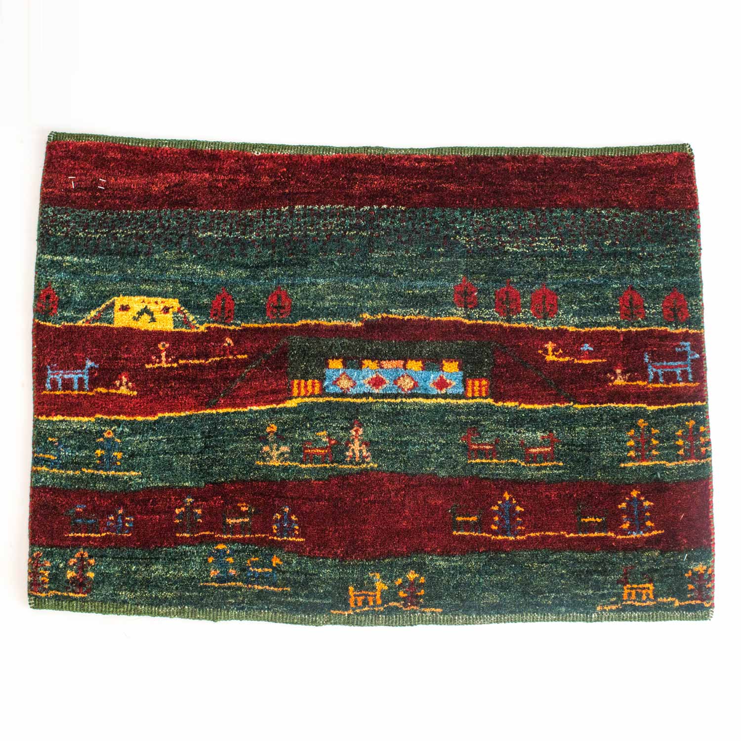 ギャッベ(ギャベ)はイラン南西部、ザクロス山脈から南部の高原で遊牧生活をしているカシュガイ族が織る1つ1つが手作りの毛足の長い絨毯です。冬は暖かく、夏も汗がべたつかず、1年を通じて快適です。また天然染料で染められており、小さなお子様がいるご家庭でも安心してお使いいただけます。