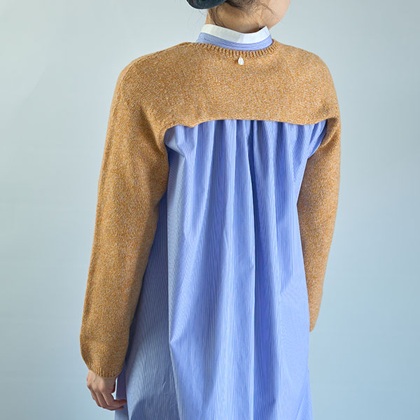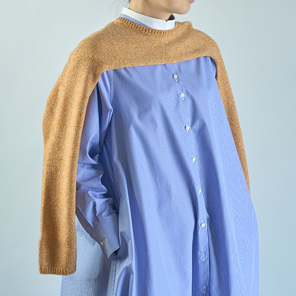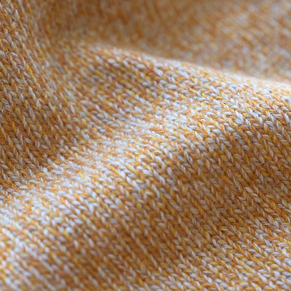 カラーの異なるカシミア&ウールの3本の糸を一つに摺り合わせた3杢糸で編み立てることにより、奥行きのある表情がうまれ、やさしく温かみのあるニットに仕上がっています。