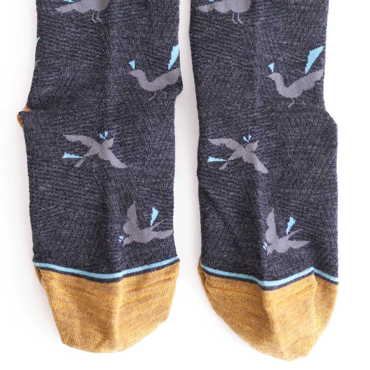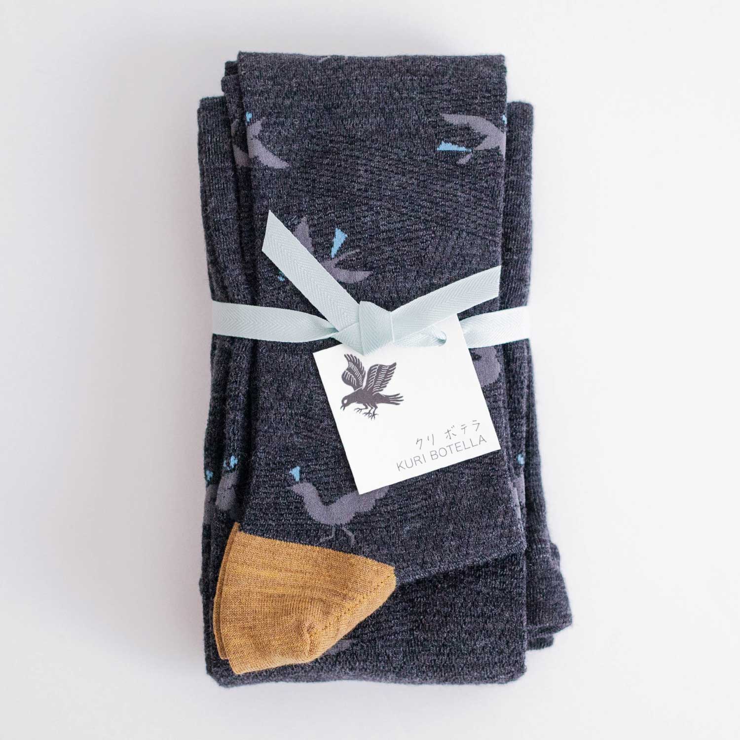 デザイナー寄神くりさんによるタイツとソックスのブランド KURI BOTELLA(クリボテラ)。影絵のような鳥の姿が斜線の地模様の上に描かれ、ダークグレーはブラックの斜線で鳥の尾のブルーがアクセントです。また、つま先とかかとに補強が入っており、丈夫な作りです。
