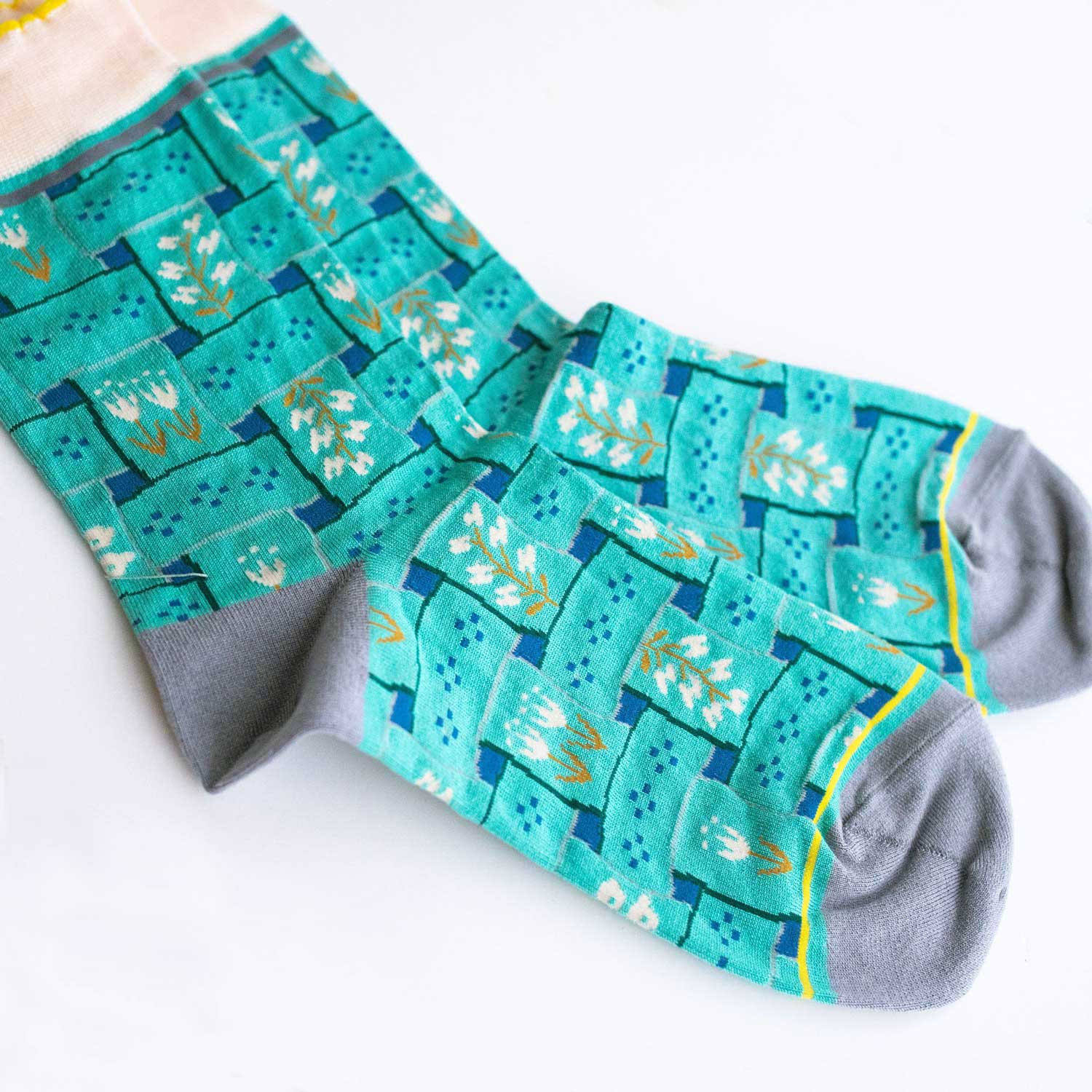 デザイナー寄神くりさんによるタイツとソックスのブランド KURI BOTELLA(クリボテラ)。織りあわさった“リボン”が描かれ、チューリップ、セージ、ノギクなどが、ちりばめられています。