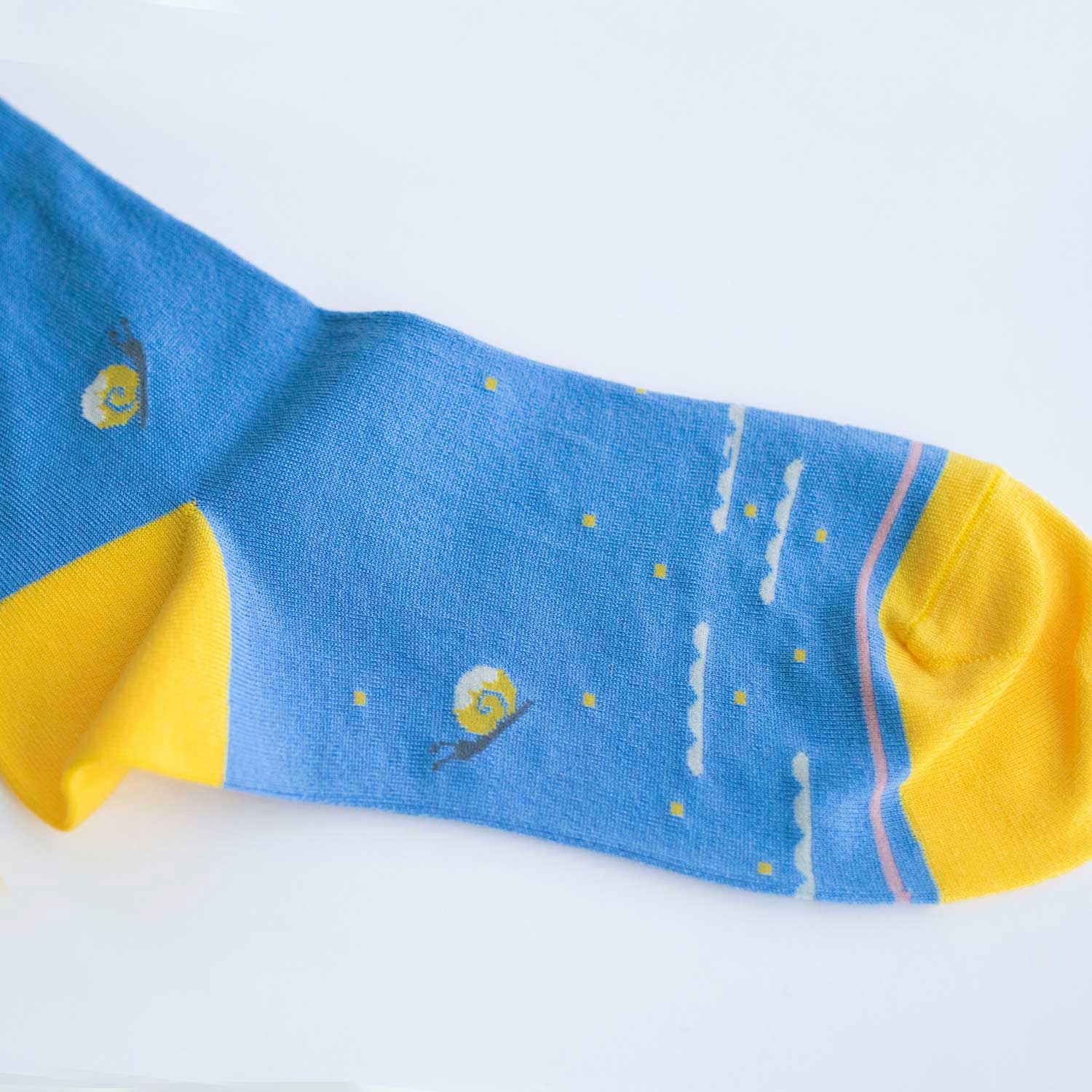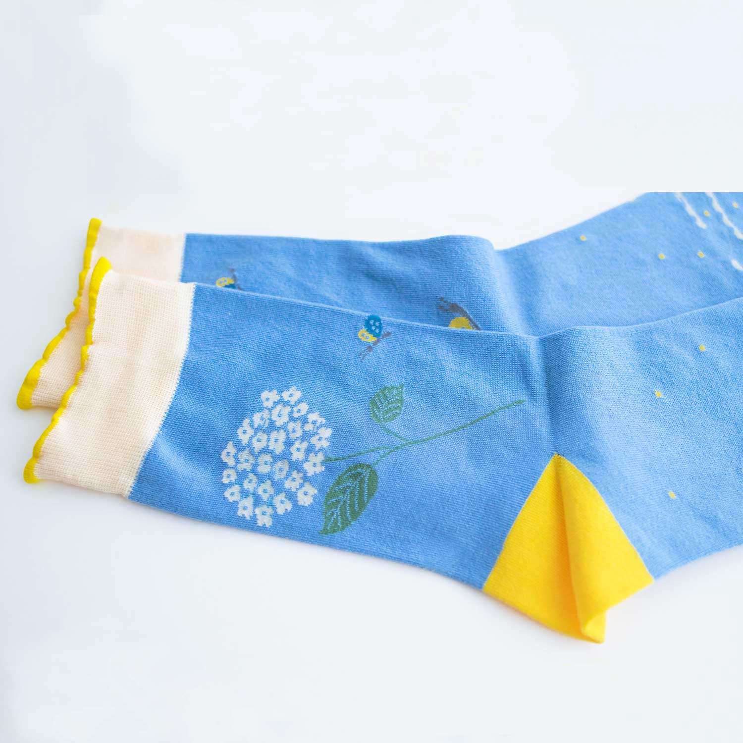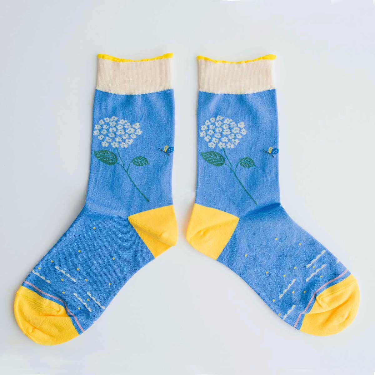 デザイナー寄神くりさんによるタイツとソックスのブランド KURI BOTELLA(クリボテラ)。陽射しがさしこむ雨あがりの花壇。“あじさい”のまわりで、ちょうちょやかたつむりが遊ぶ姿を描いたソックス。つま先まわりには、雲柄が描かれています。