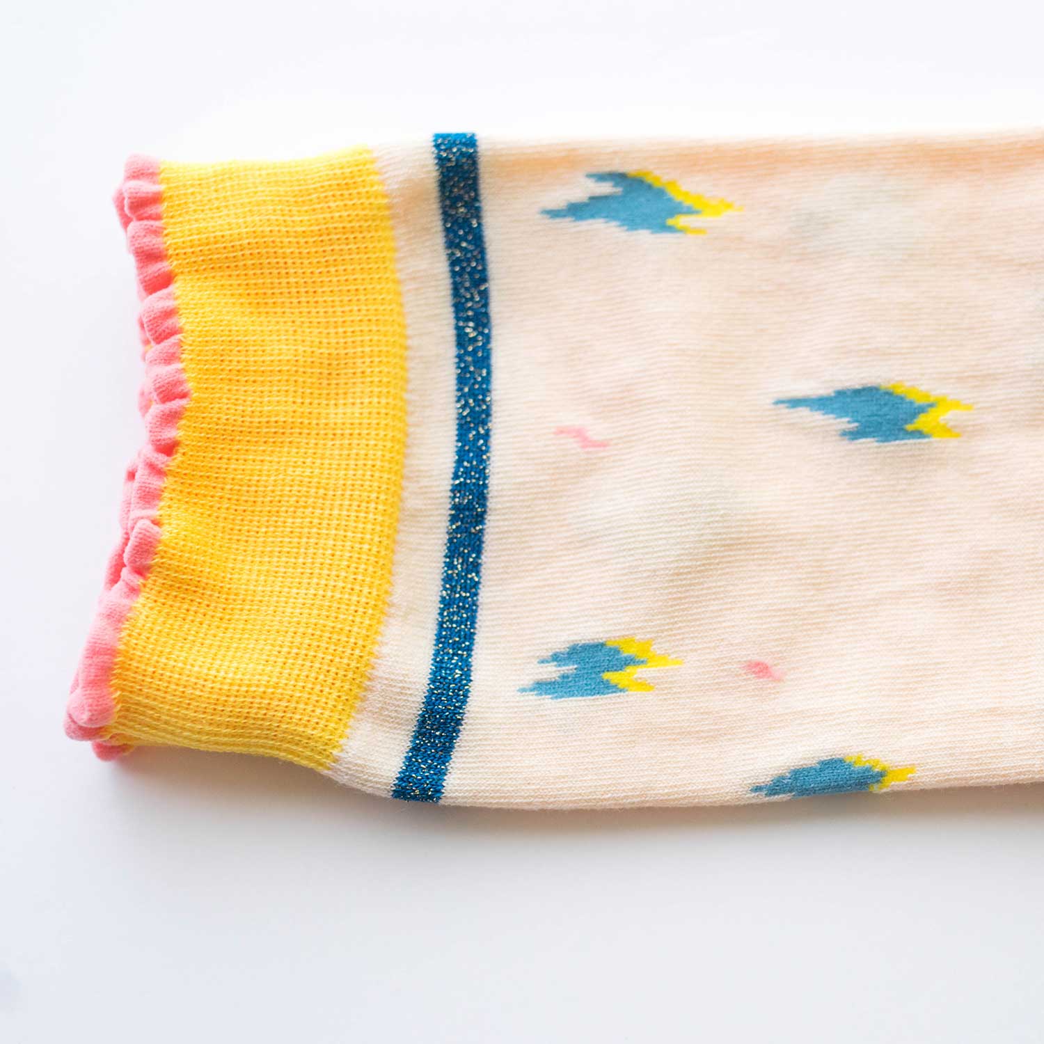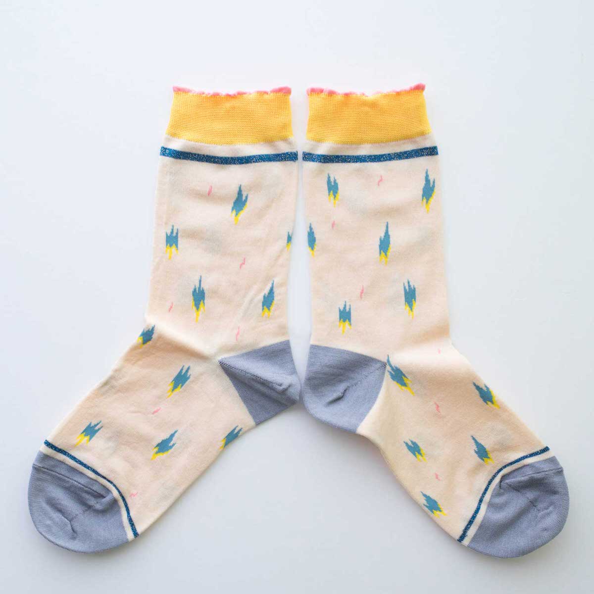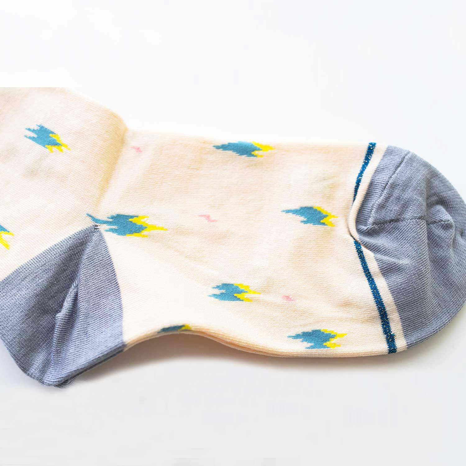 デザイナー寄神くりさんによるタイツとソックスのブランド KURI BOTELLA(クリボテラ)。ギザギザ模様がランダムに描かれ、ラメ糸のラインもはいり、シャープでポップな雰囲気のデザイン。やさしい光沢とシャリ感のある上質のシルケットコットンを使用しています。