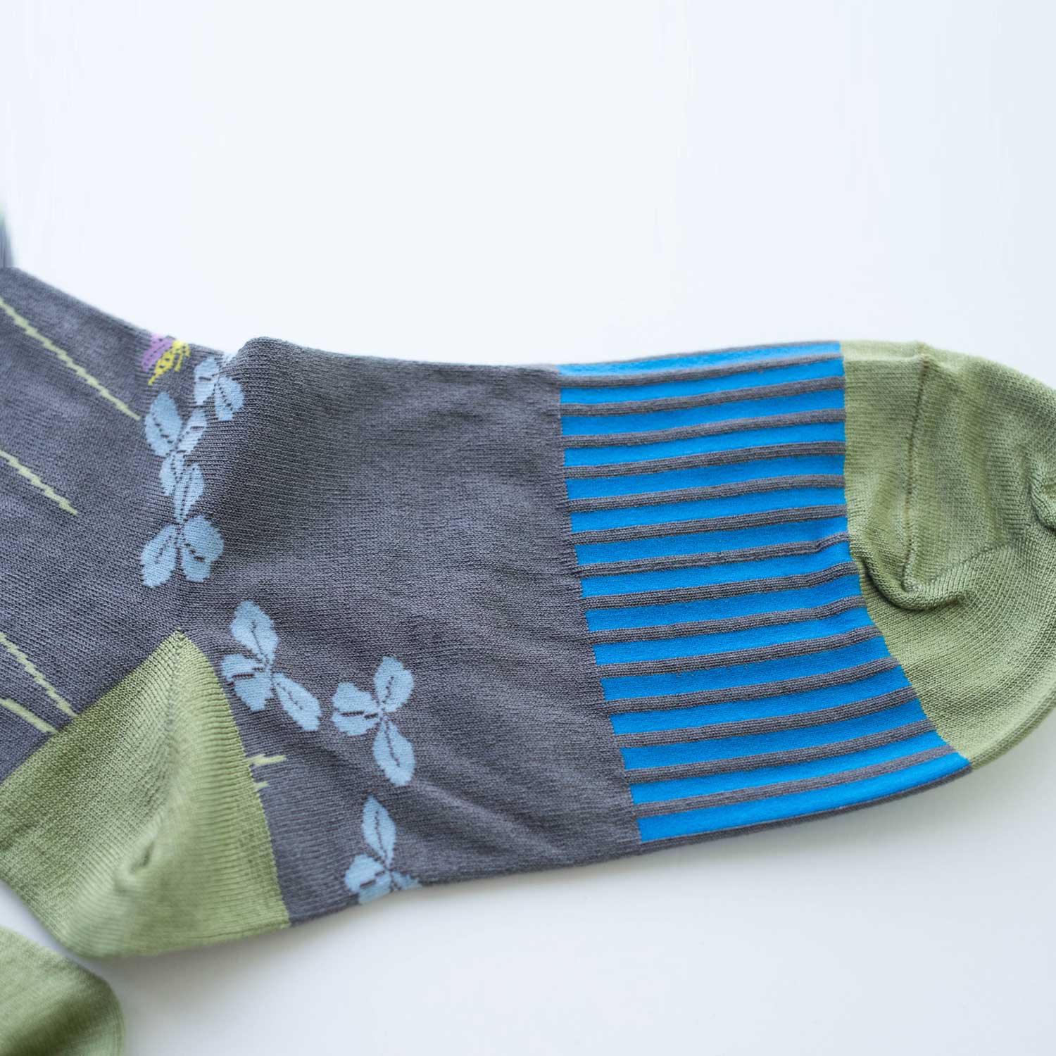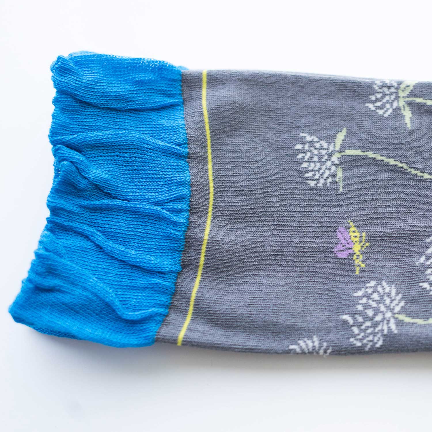 デザイナー寄神くりさんによるタイツとソックスのブランド KURI BOTELLA(クリボテラ)。シロツメグサのまわりにミツバチがとんでいる草原の風景が描かれています。やさしい光沢とシャリ感のある上質なシルケットコットンを使っています。