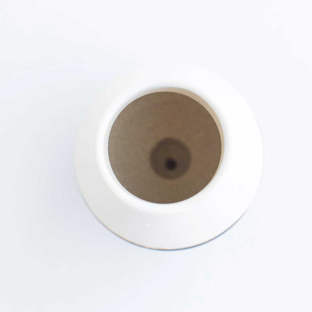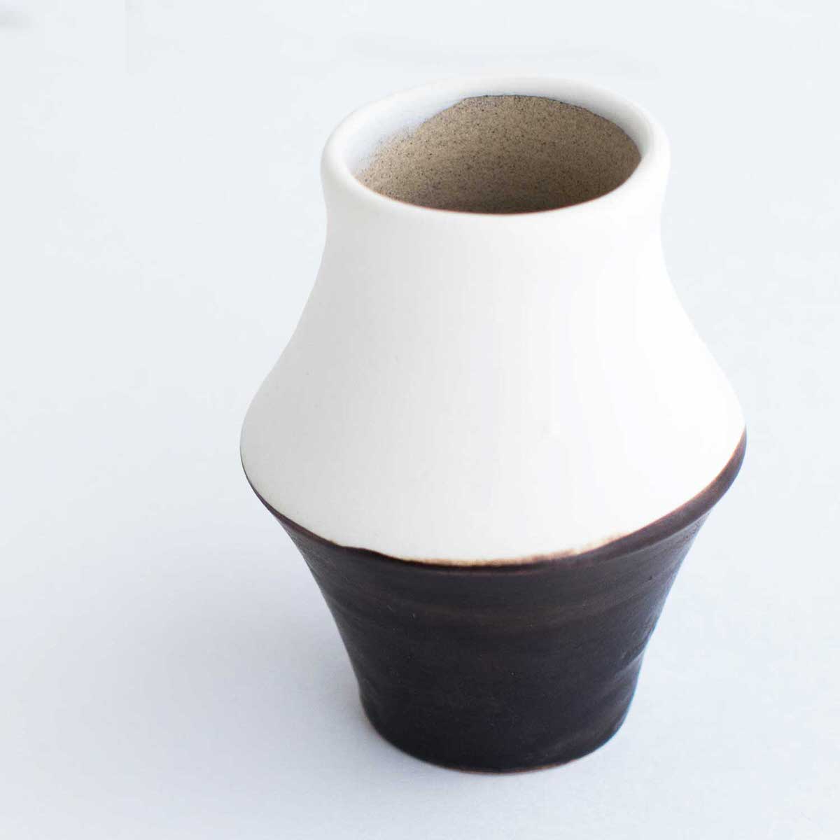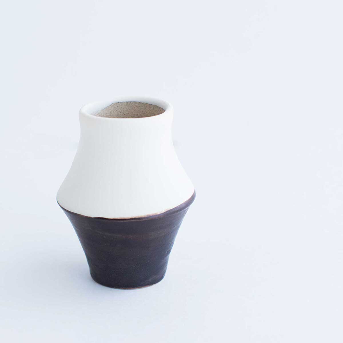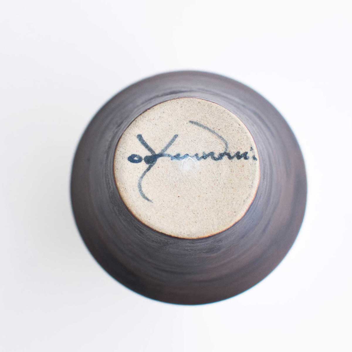 雲仙市の小浜温泉に工房を構えた陶芸家オクウンヒさんの一輪挿しです。小さな底穴に枝を差し込むと、1本のお花でもスッとそびえ立つような工夫が施されております。